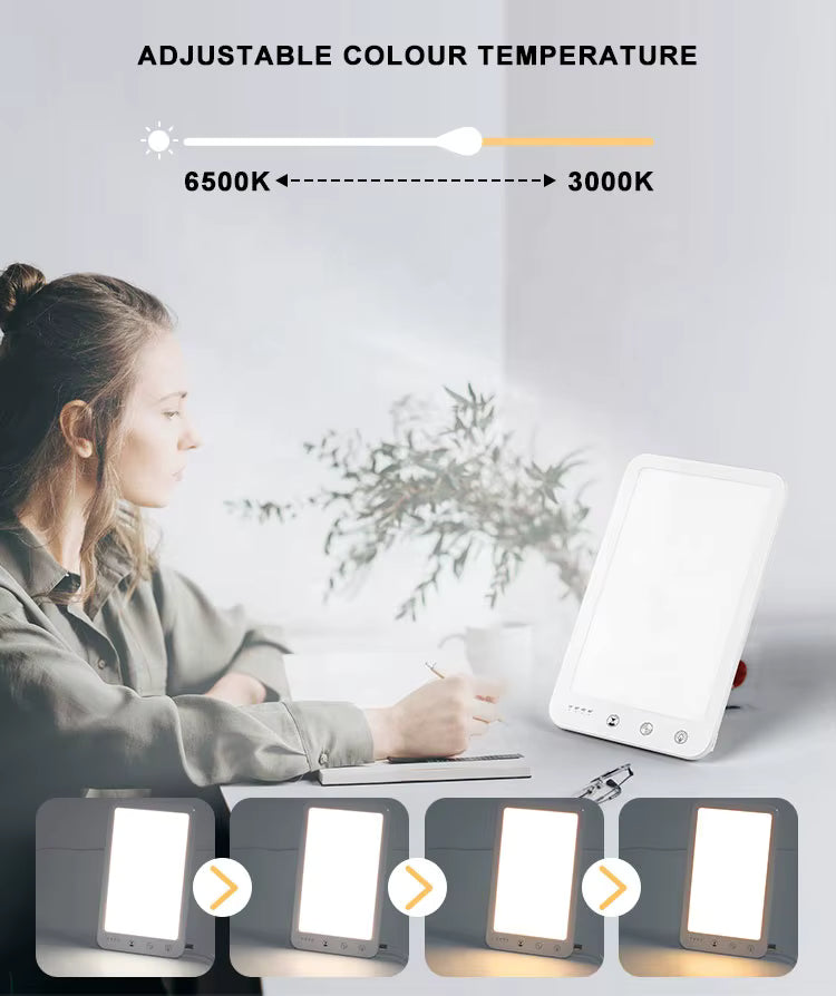 Lampinn býður upp á 10.000 Lux birtustig, 4 litatóna, 5 birtustillingar og 4 tímastillingar, svo þú getur sérstillt upplifunina að þínum þörfum.