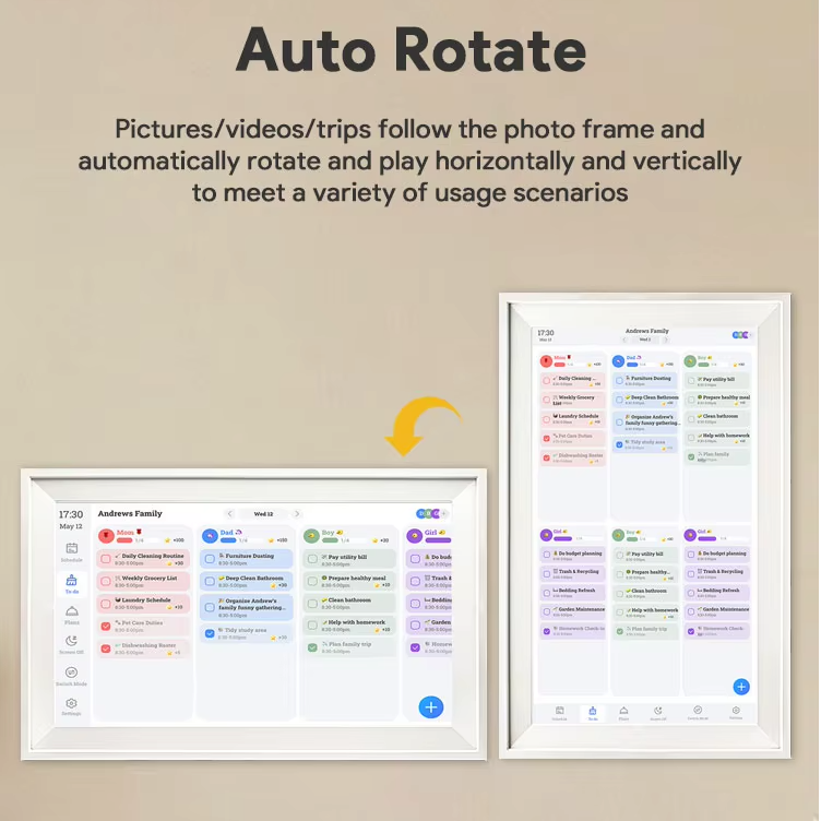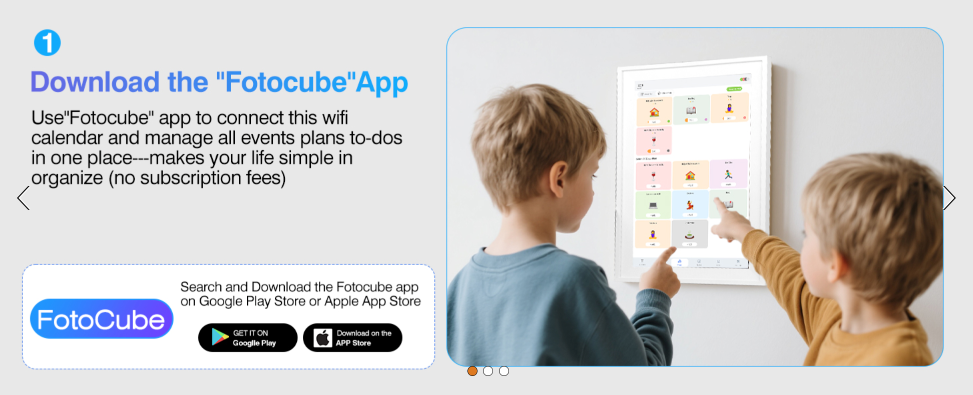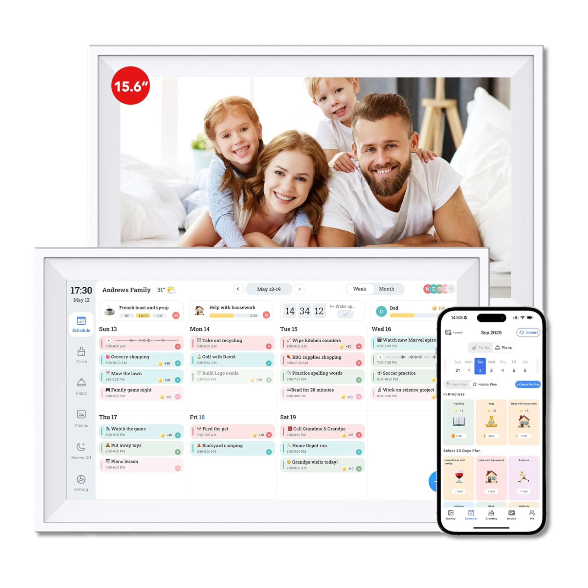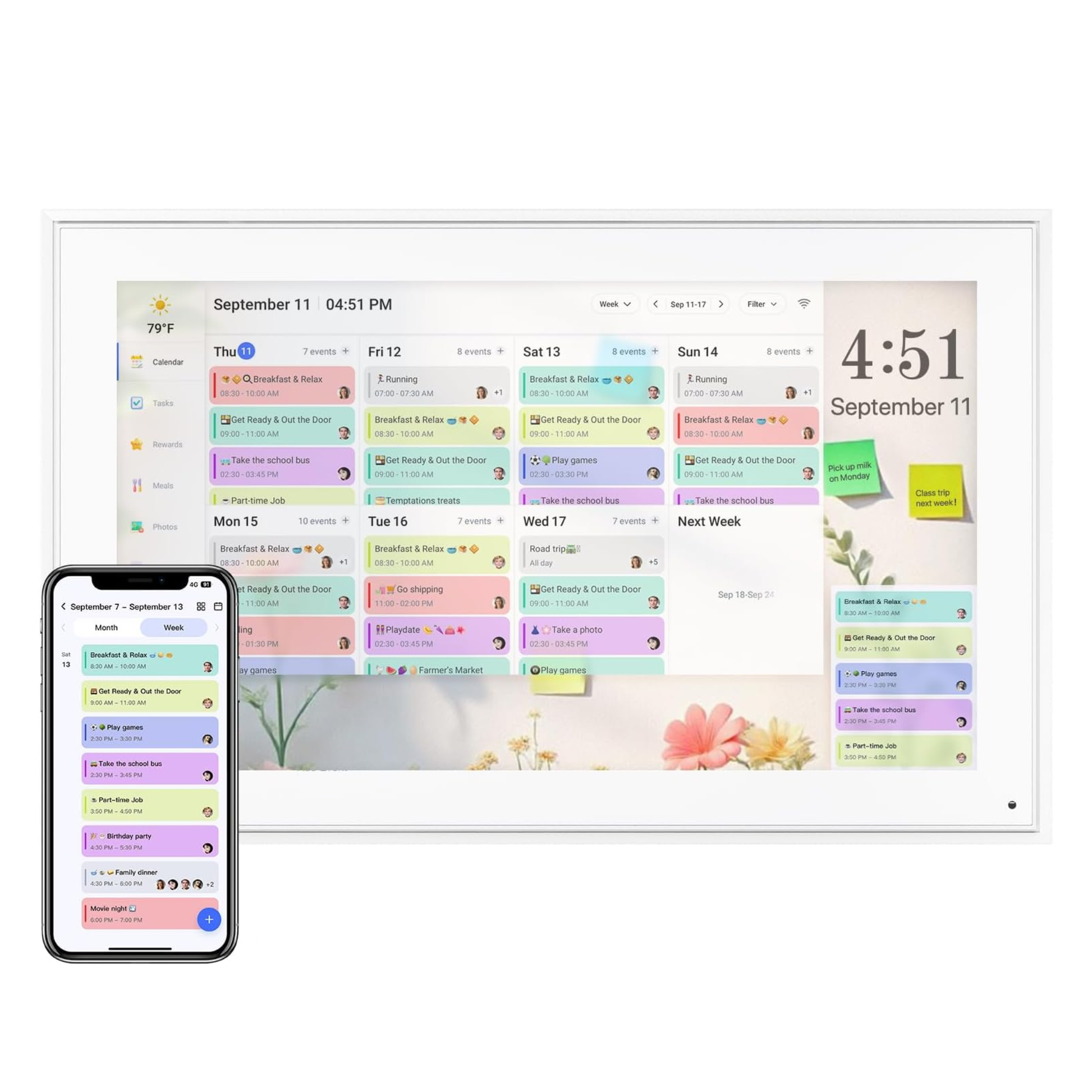 Dagatalið er með stórum og skýrum snertiskjá, einfalt viðmót og getur bæði staðið á borði eða verið hengd á vegg. Hún tengist símanum þínum í gegnum app svo öll fjölskyldan getur samstillt verkefni og áætlanir í rauntíma.