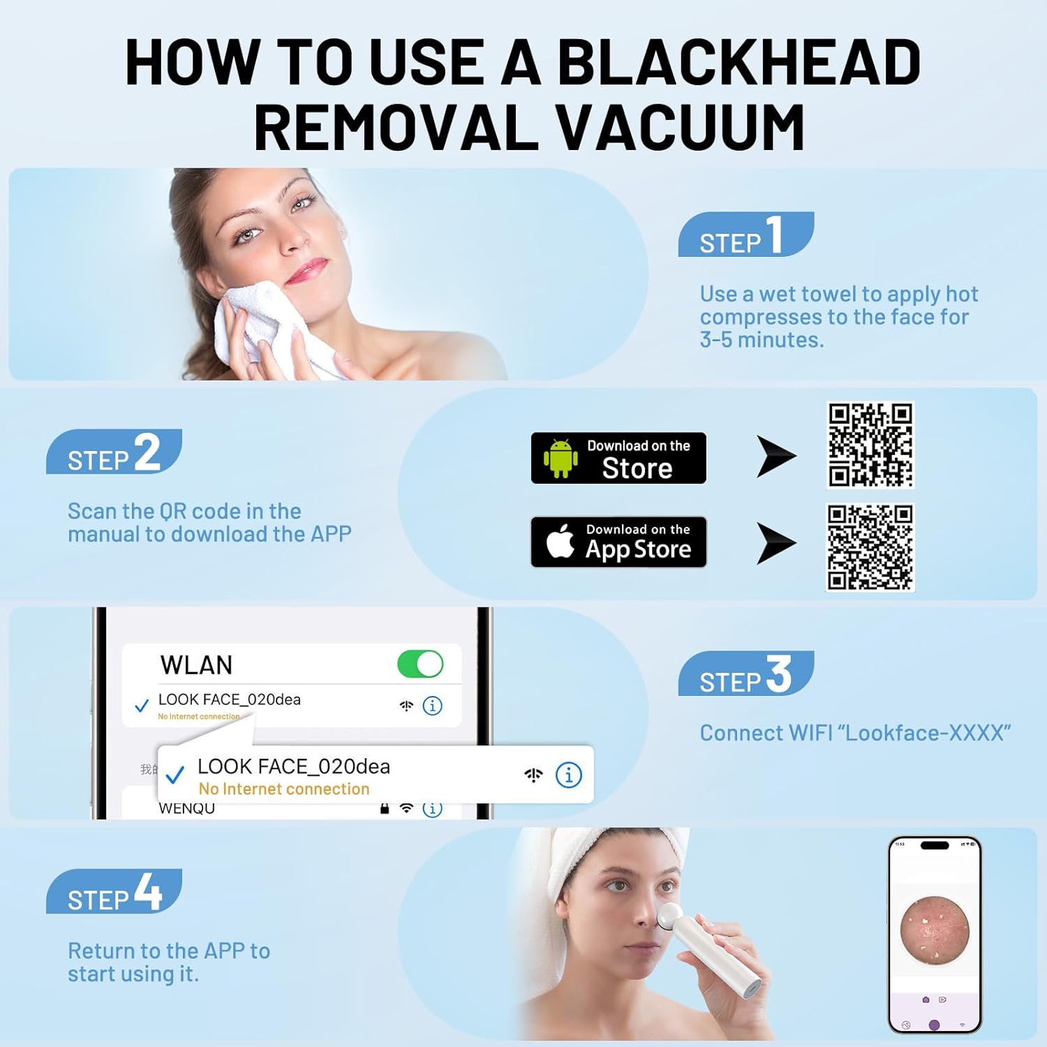 Með innbyggðri myndavél geturðu fylgst með hreinsuninni í rauntíma og tryggt að hver einasti svitapori verði hreinsaður.