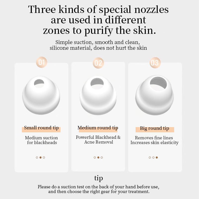 Tækið kemur með 3 stillanlegum sogstyrkjum og 3 mismunandi hausum til að henta mismunandi húðsvæðum. Frá viðkvæmum svæðum eins og nefi til stærri svæða á enni og kinnum. Hentar bæði konum og körlum sem vilja faglega húðumhirðu heima hjá sér.