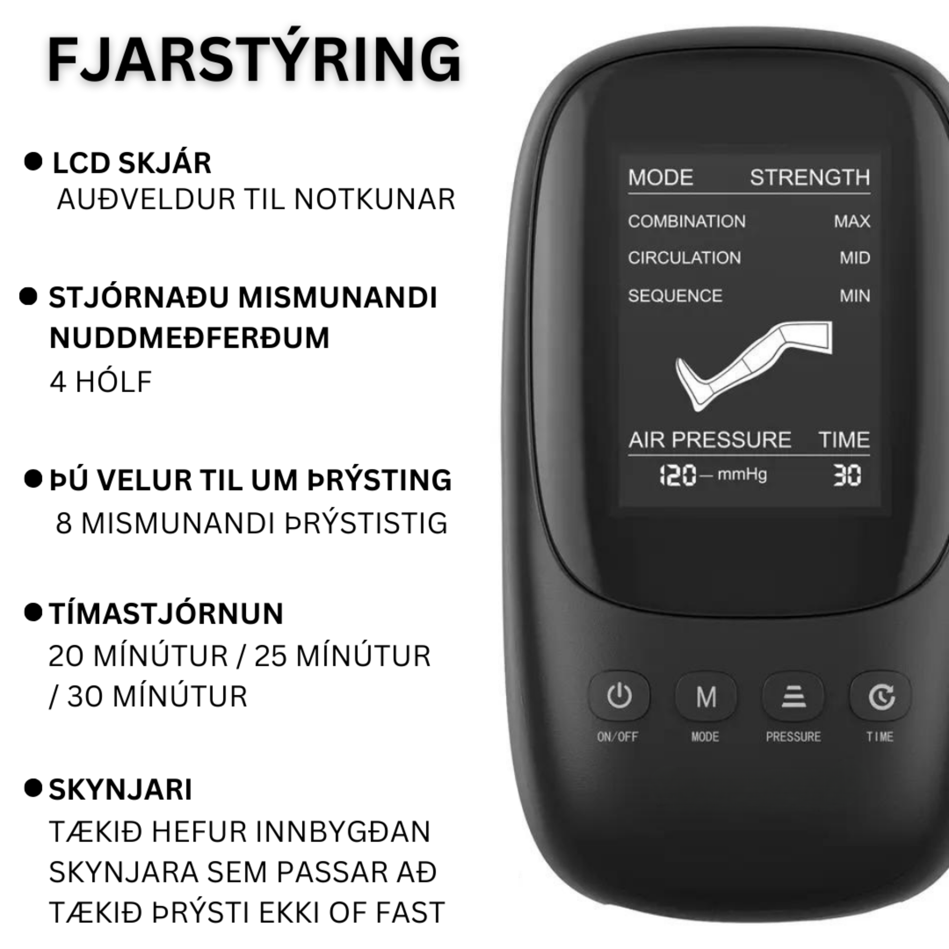 Þrýstinuddtækið er fullkomið fyrir þá sem vilja hraðari endurheimt eftir æfingar, minnka bjúg í fótum eða draga úr vöðvaspennu.